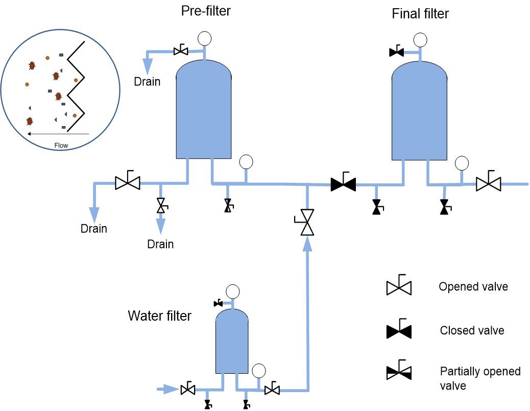 Cold Water Rinse for Pre-Filter and Final Filter: Drain entire assembly.-> Adjust the valve position as shown in the picture-> Start the clean water flow ->The rinse water flow rate should be greater than or equal to the process flow rate (1 and 1.5 times the process flow provided the differential pressure does not exceed 300 mbar). Low flow velocity during cleaning may result in insufficient or partial filter cleaning-> Continue in this mode until the effluent appears free of product.